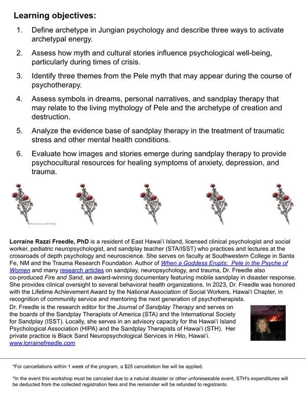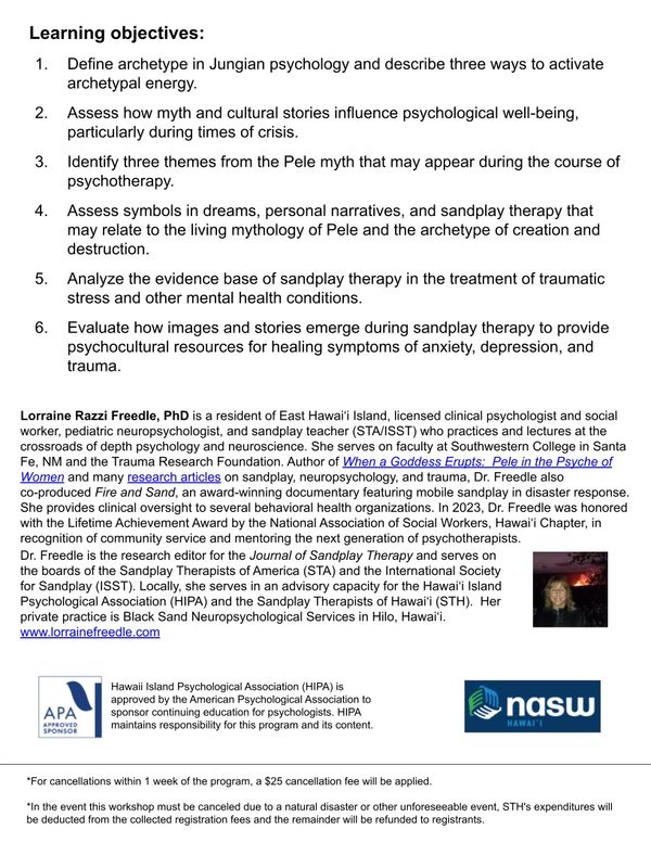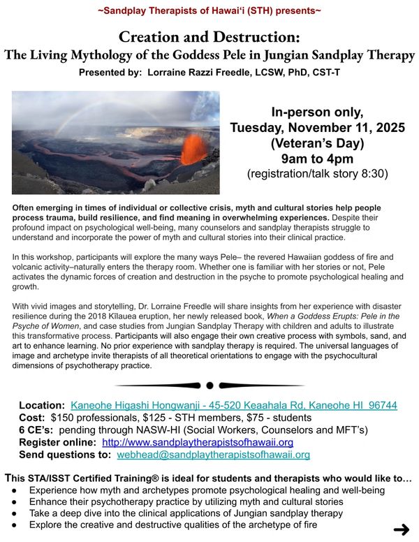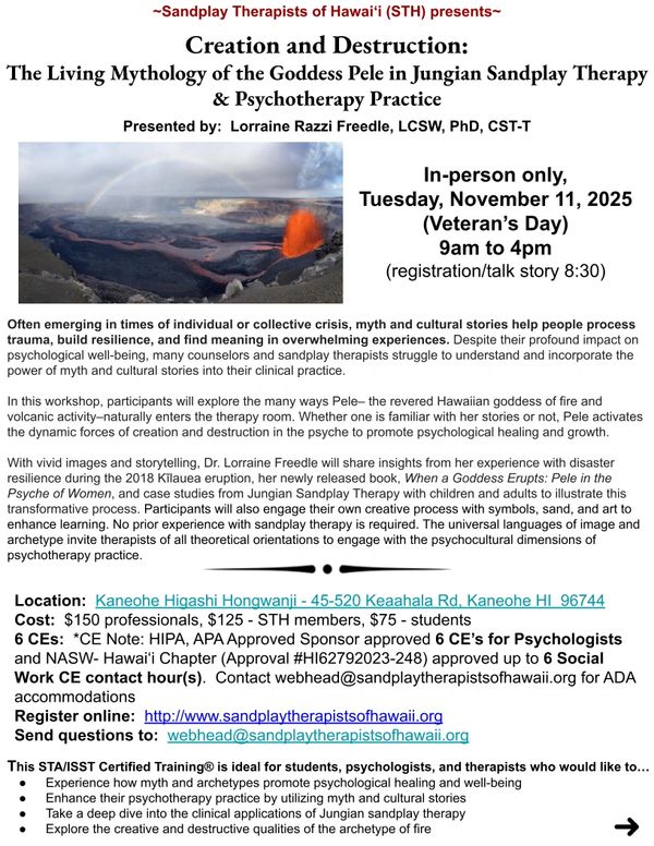 Questions or requests for ADA accommodations? Contact Dr. Lorraine R. Freedle, Sandplay Therapists of Hawaiʻi CE Chair: lrfreedle@gmail.com